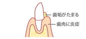 歯肉(歯ぐき)と歯の間にはポケットという1mmくらいのすき間があります。歯みがきを怠ってしまうとこのポケットに歯垢がたまります。たまった歯垢が歯石をつくり、すき間を押し広げていきます。これを積み重ねることで歯肉が炎症を起こします。これが歯肉炎で、歯周病の第一歩です。 歯肉炎にかかると歯ぐきは赤く腫れ、リンゴをかじったときなどに歯ぐきから血が出ます。歯肉炎を放置しておくと症状はますます悪化し、歯周炎へと進んでいきます。この様に歯周病は主に歯ぐきと歯の間のブラッシングがきちんと出来ていないのが原因となります。