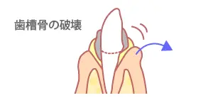 ポケットでの炎症が慢性化し、歯根膜、歯槽骨が先端部より溶けてきます。このころは口臭もあり歯が浮いた感じがします。強くかむと痛みを伴い、歯がぐらついてきます。